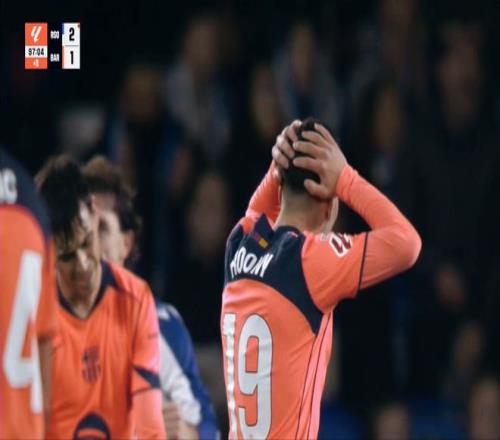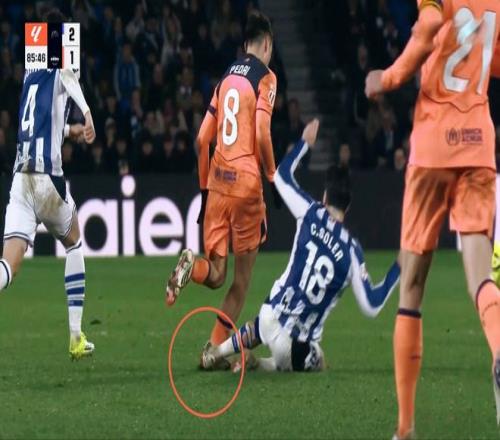 佩德里屡遭凶狠的犯规,但是裁判始终无动于衷。孔德门前头球,重重击中横梁弹出!第88分钟,索莱尔飞铲佩德里,裁判经过视频回放鉴定后,直接红牌罚下。经过长达9分钟的补时,最终10人的皇家社会守住了胜局。